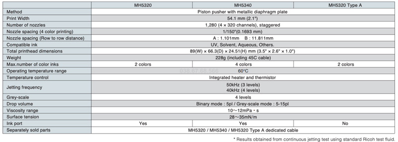 Bảng thông số kỹ thuật đầu phun Ricoh Gen 6: