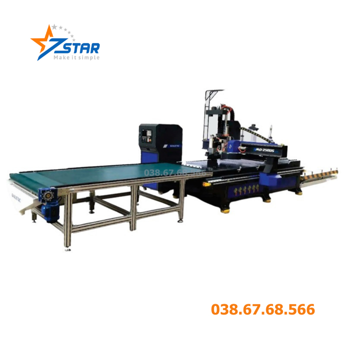 - Bàn cấp phôi tự động đứa tấm vào cắt, và tự động đẩy tấm ra khi cắt xong giúp giải phóng được nhân công rất hiệu quả.