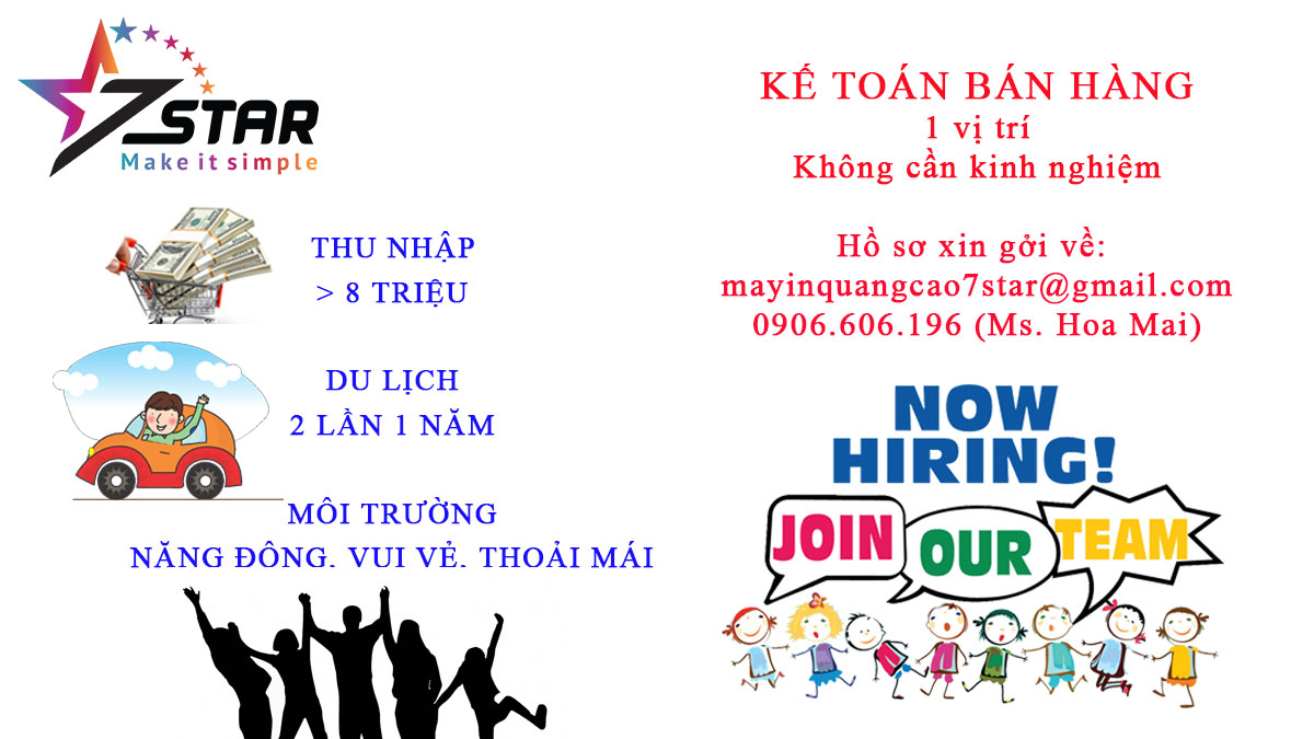 Máy in quảng cáo 7STAR cần tuyển 1 nhân viên kế toán bán hàng không cần kinh nghiệm làm việc full-time tại Tân Phú, Hồ Chí Minh.